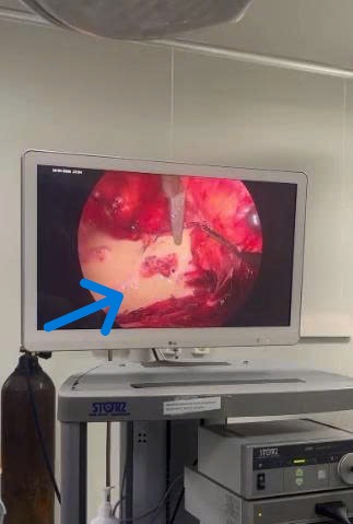 Sau khi hội chẩn, các bác sĩ chỉ định phẫu thuật nội soi sau phúc mạc lấy sỏi niệu quản. Trong quá trình phẫu thuật, kíp mổ gồm BS.CKI. Phan Văn Đức và BS. Vũ Thái Bảo (Khoa Ngoại) ghi nhận khoảng 100ml dịch mủ thoát ra khi bộc lộ và mở niệu quản, cho thấy tình trạng nhiễm trùng do tắc nghẽn kéo dài. Viên sỏi kích thước lớn 2 cm đã được lấy ra an toàn, đồng thời đặt sonde JJ nhằm đảm bảo lưu thông nước tiểu, giải phóng tắc nghẽn và hỗ trợ phục hồi chức năng thận.