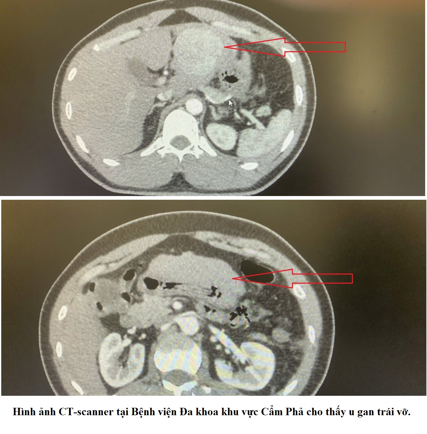 -Hình ảnh CT-scaner xác định có khối u gan trái kích thước 58x55mm, ngấm thuốc mạnh, sau tiêm thì động mạch có động mạch đi vào trung tâm khối, có phần bờ mất liên tục, gây chảy máu trong bao lan theo mạc nối nhỏ xuống mặt trước dạ dày (kích thước 23mm) kèm theo có dịch tăng đậm độ dạng máu trong ổ bụng.