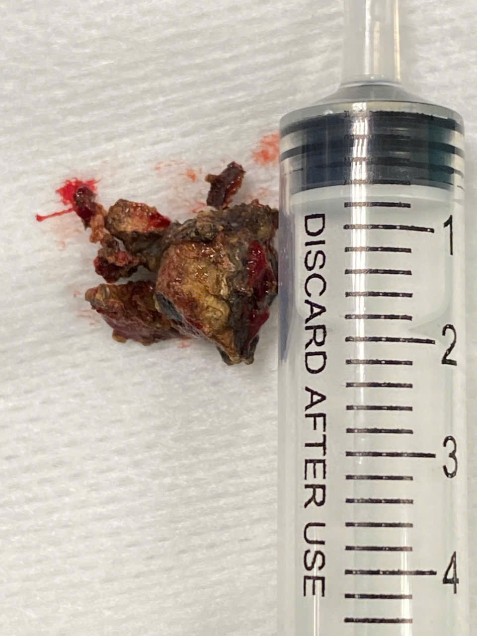 Qua nội soi tai mũi họng bằng hệ thống thiết bị hiện đại, bác sĩ phát hiện có một khối cứng, chắc, bám vảy nâu nằm sâu trong hốc mũi phải, lấp đầy hốc mũi, gây chèn ép, cản trở hô hấp nghi ngờ là sỏi mũi hoặc nấm xoang. Sau khi hội chẩn, kíp bác sĩ gồm BS.CKILý Văn Ngọt - Khoa Tai Mũi Họng), BS.CKIIĐỗ Ngọc Lâm - Trưởng khoa Phẫu thuật & Gây mê hồi sức đã tiến hành nội soi và lấy ra là 01 viên sỏi kích thước khoảng 1cm,đã bám mủ. Thủ thuật được thực hiện an toàn. Bệnh nhân ổn định sau can thiệp.