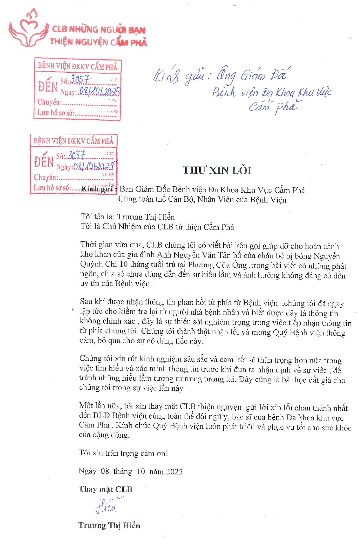 Tại buổi làm việc, bà Trương Hiển và đại diện Câu lạc bộ “Những người bạn Thiện nguyện Cẩm Phả” thẳng thắn thừa nhận sai sót, bày tỏ sự ăn năn, cầu thị, đồng thời gửi văn bản xin lỗi đến lãnh đạo Bệnh viện (đăng kèm theo) và khẳng định việc đăng tải thông tin trước đó do chưa kiểm chứng đầy đủ và không mang mục đích xấu. Trước đó, bà Trương Hiển đã gỡ bỏ toàn bộ nội dung sai lệch, đăng bài xin lỗi Bệnh viện công khai trên Facebook cá nhân (Đường link Facebook: https://www.facebook.com/truong.hien.789847) ngay trong buổi sáng ngày 03/10/2025; hôm nay - tiếp tục có cam kết không xảy ra tái phạm trong thời gian tới và bày tỏ mong muốn được đồng hành cùng Bệnh viện trong các hoạt động thiện nguyện, hỗ trợ bệnh nhân có hoàn cảnh khó khăn (nếu có).
