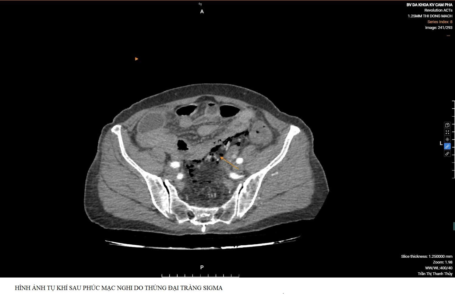 Nhận định đây có thể là một bệnh lý ổ bụng tiềm ẩn diễn biến nặng, bệnh nhân được chỉ định chụp cắt lớp vi tính ổ bụng cấp cứu. Kết quả ghi nhận: Hình ảnh tụ khí sau phúc mạc - dấu hiệu gợi ý thủng đại tràng sigma. Đây là một dấu hiệu kín đáo trên lâm sàng nhưng rất có giá trị trong chẩn đoán, giúp định hướng kịp thời xử trí tiếp theo.