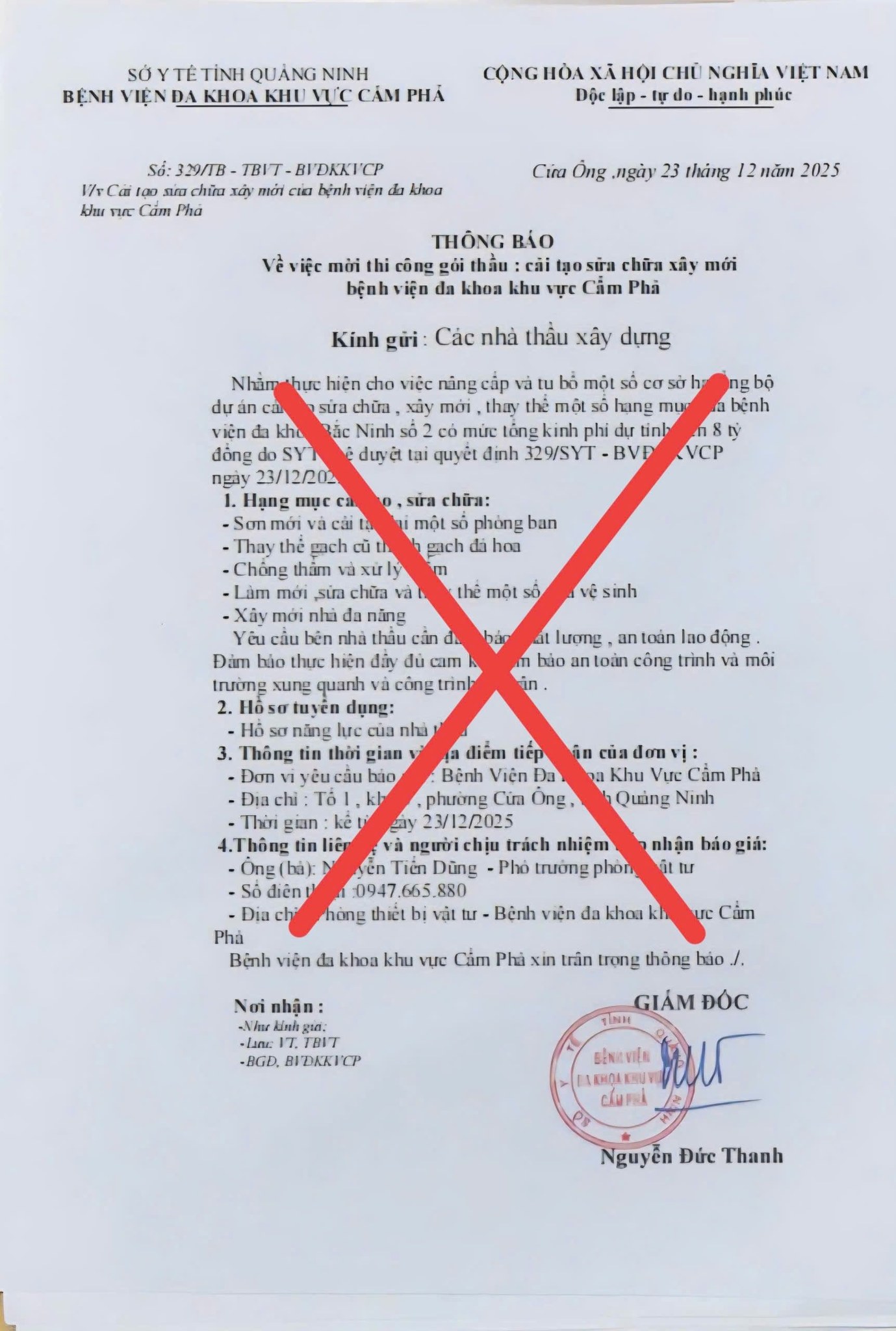 Trong thời gian gần đây, Bệnh viện Đa khoa khu vực Cẩm Phả nhận được phản ánh của công dân về việc xuất hiện một số văn bản/Thông báo được gửi trực tiếp tới các tổ chức, cá nhân, mạo danh Bệnh viện, với các nội dung liên quan đến:
